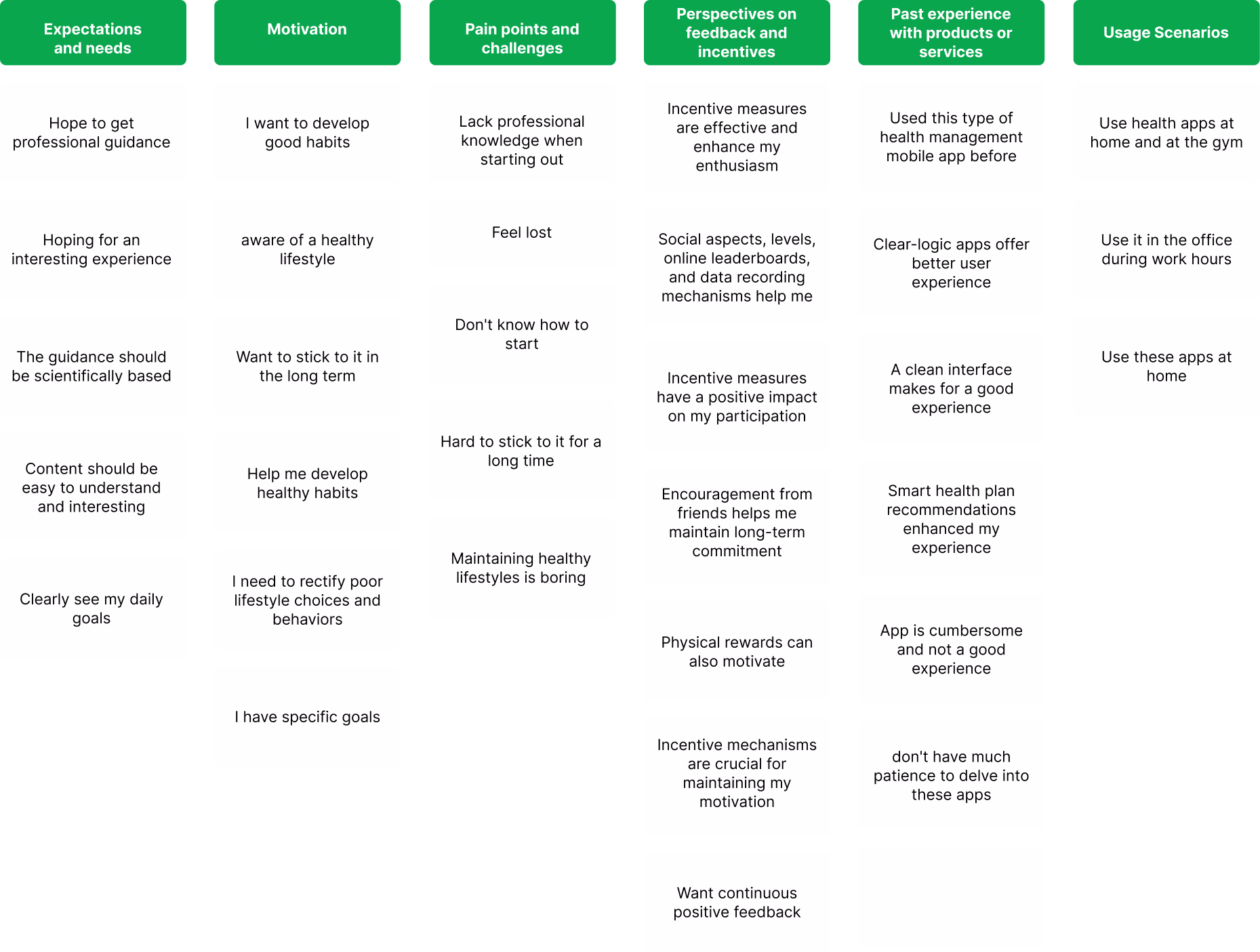 The extracted key sentences or ideas are categorised and organised according to relevance, and each group is next analysed to summarise the main findings. This helps to better understand user needs and behaviours and provides guidance for further design and development work.